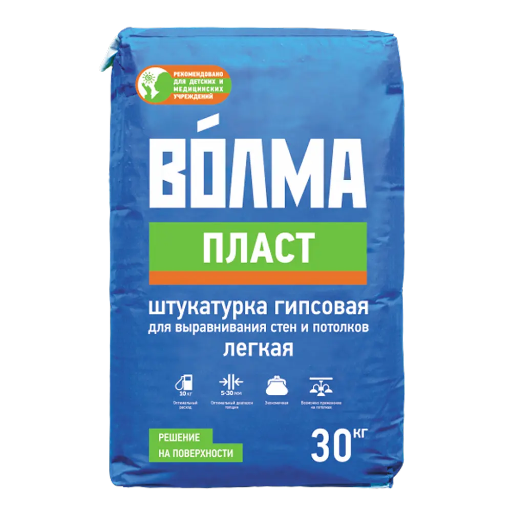 Гипсовая штукатурка Волма Пласт — сухая строительная смесь на основе гипсового вяжущего с минеральными наполнителями и модифицирующими добавками. Предназначена для высококачественного выравнивания стен и потолков внутри помещений. Подходит для ручного нанесения, обеспечивает гладкую поверхность, готовую к финишной отделке — покраске, оклейке обоями или облицовке плиткой. Соответствует требованиям ГОСТ Р 58279‑2018.